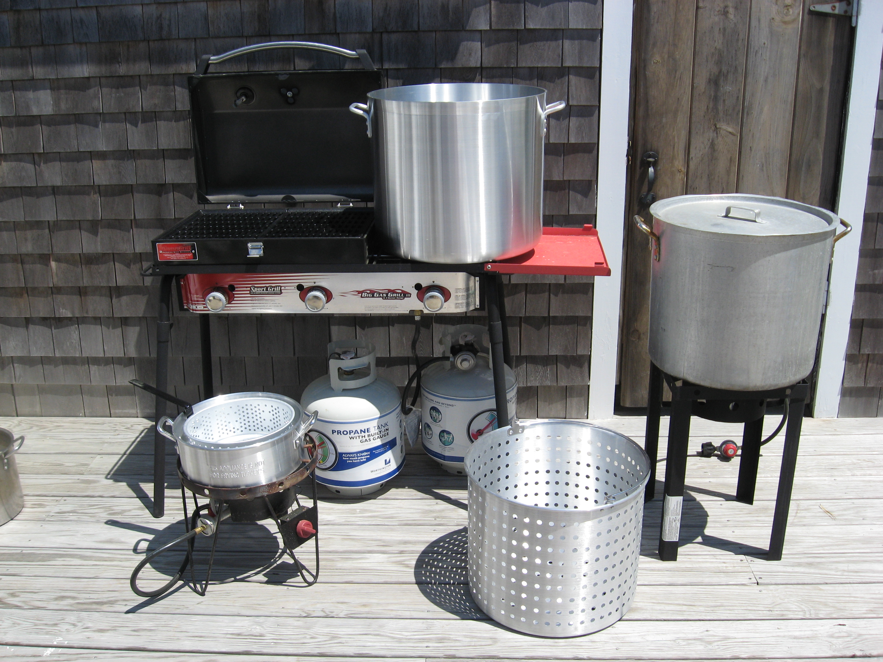 80qt., 60qt, 10qt. steamers with strainers and the Big Gas Grill. Everything for a portable clambake.